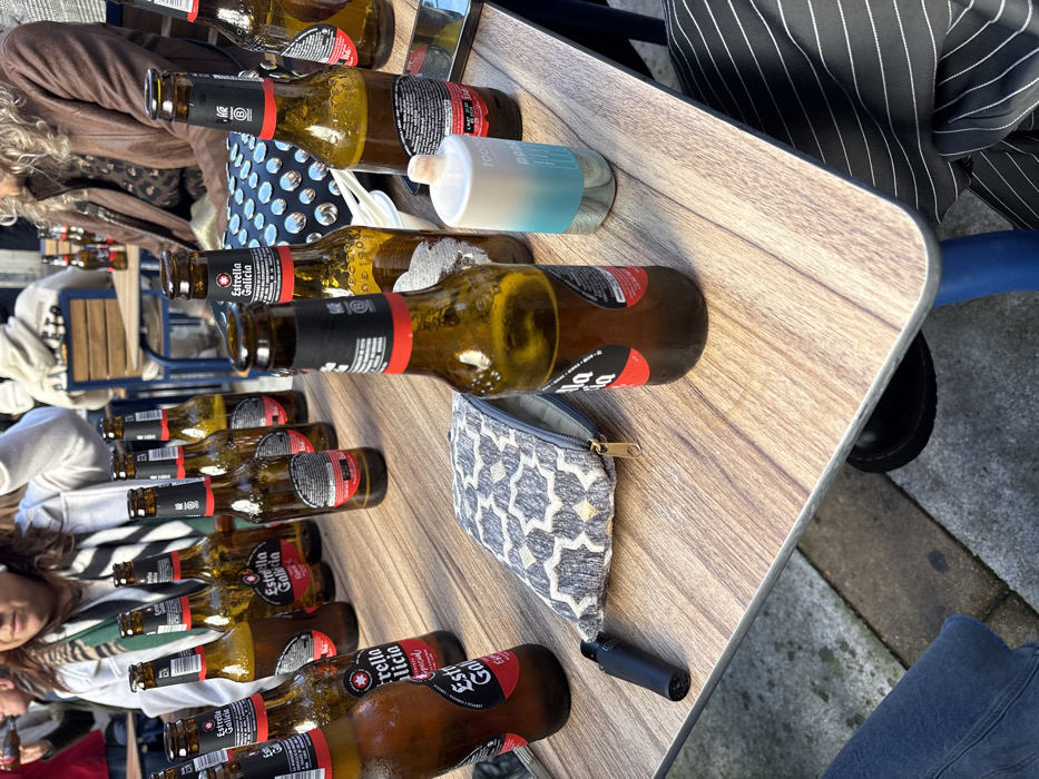 - "The image presents an outdoor café table, likely in Córdoba, Spain, covered with approximately fifteen amber glass bottles of "Estrella Galicia" beer" by FM-Y5o3W2, licensed under CC BY 4.0