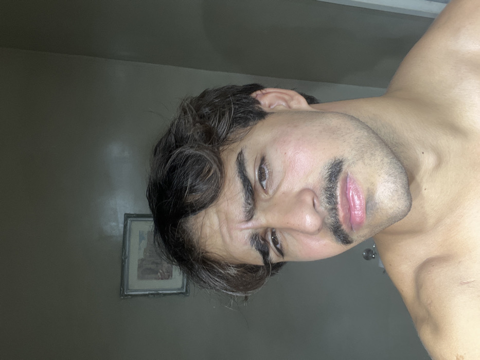 A man faces the camera at an angle. He has dark hair with highlights, a light beard, and a mustache. His skin appears clear. A framed picture is visible on the wall behind him. The wall is painted in a muted, glossy color. A portion of his bare shoulder is visible in the foreground. The lighting in the room is soft.
