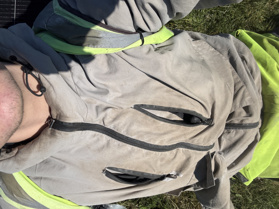 A first-person view captured from above details the upper torso and lower facial area of an individual. The subject wears a light grey hooded jacket, soiled with dark smudges and dirt, featuring a central black zipper and two partially open zipped chest pockets. A neon yellow-green reflective strap with a central grey reflective strip is visible over the right shoulder area, consistent with safety wear. Below the jacket, a portion of a neon yellow-green garment is visible. The individual exhibits stubble on their chin and jaw. The immediate environment includes green grass, indicating an outdoor setting. A dark, gridded rectangular object, consistent with a solar panel, is partially visible in the upper right background. The scene is illuminated by bright sunlight, casting sharp shadows. The specific location within Southampton, United Kingdom, is not discernible from the visual evidence.