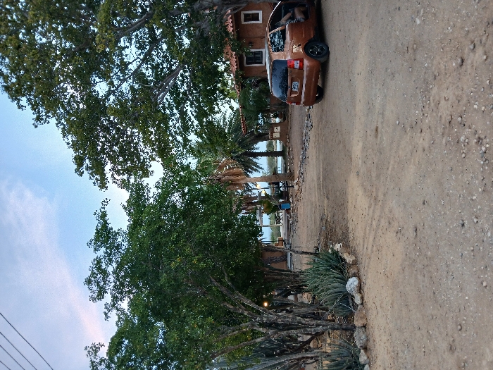 The image depicts an outdoor scene in Guayacancito, Venezuela, characterized by a semi-arid environment under a clear blue sky with sparse clouds. The foreground consists of unpaved, light brown dirt ground with scattered pebbles. To the left, a cluster of thorny cacti and succulent plants, including several agave-like species, are arranged within a natural rock-lined bed. Behind these plants, multiple green-leafed trees of varying sizes are present, with some small artificial lights visible among their branches. Electrical or utility lines traverse the upper left corner of the frame. In the middle ground, the dirt path leads toward a distant body of water, likely the ocean or a bay, with a hazy horizon. Along this path, various structures are visible: an outdoor seating area with tables and chairs under a partial shelter, a blue container, and several palm trees. On the right side of the image, a compact, bronze-colored car, equipped with black wheels, is parked facing away from the viewer on the dirt ground. The driver's side door is open, revealing the lower legs of an individual, clad in light-colored footwear and trousers/shorts, in the process of exiting or entering the vehicle. Adjacent to the car, a rustic, terracotta-colored building with a tiled roof features two white-framed windows. No other individuals are clearly visible or engaged in specific actions.