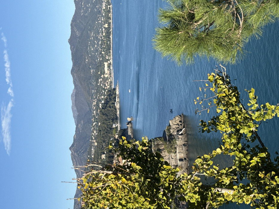 This image depicts a high-angle view of the Ligurian Sea and coastal landscape around Portofino, Italy, under clear skies. In the immediate foreground, branches with light green, fan-shaped leaves (likely a Ginkgo tree) partially frame the left side of the scene, while dark green pine branches frame the right. The midground features a prominent, steep, rocky promontory extending into the sea on the left. This promontory exhibits multiple terraced levels and structures, possibly paths or building foundations, with a portion of a building featuring a red-tiled roof visible at its apex. A small, dark boat is positioned near the base of this promontory in the calm blue water. Further into the midground, the expansive sea surface displays minimal ripples. Two small white motorboats are visible on the water, one closer to the central horizon and another slightly to its left, both leaving faint wakes. The background reveals a distant, undulating coastline densely populated with numerous light-colored buildings interspersed among green vegetation on hills. Behind these coastal hills, a range of dark green mountains rises towards the horizon. The sky is clear and bright blue, with one small, wispy white cloud visible near the top left. No individuals are discernibly present in the scene.