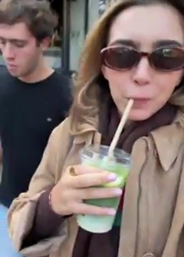 A woman wearing sunglasses and a tan jacket holds a green drink with a straw and walks alongside a man in a black t-shirt and light blue jeans
