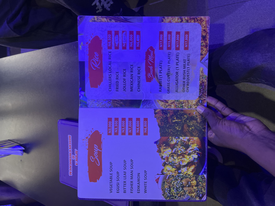 A dimly lit interior shot shows a person's dark-skinned right hand holding an open restaurant menu. The menu is brightly illuminated, contrasting with the surroundings. The establishment is "Africa & Intercontinental" in Barakin Lerawi, Nigeria, as indicated by an inverted menu/bill holder visible on a dark table in the upper-left. The menu's left page, titled "Soup," lists "VEGETABLE SOUP (N3,000)", "EGUSI SOUP (N3,300)", "BITTER LEAF SOUP (N3,000)", "FISHER MAN SOUP (N7,000)", "EDIKAIKON (N4,600)", and "WHITE SOUP (N6,800)", accompanied by three images of soup dishes. The right page features "Rice" options: "CHILLERS LOCAL RICE (N6,500)", "FRIED RICE (N5,000)", "JOLLOF RICE (N5,000)", "MEXICAN RICE (N6,000)", and "CHINESE RICE (N6,500)". Below the rice, a "Bush Meat" section offers "RABBIT (1 PLATE) (N17,000)", "GRASS CUTTER (1 PLATE) (N15,000)", "ALLIGATOR (1 PLATE) (N17,000)", and "OTHER BUSH MEAT ON REQUEST (1 PLATE) (N17,000)". All prices are in Nigerian Naira. The person's lap, covered by dark trousers, is visible below the menu. The ambient lighting of the restaurant exhibits a cool, possibly blue or purple, tint.