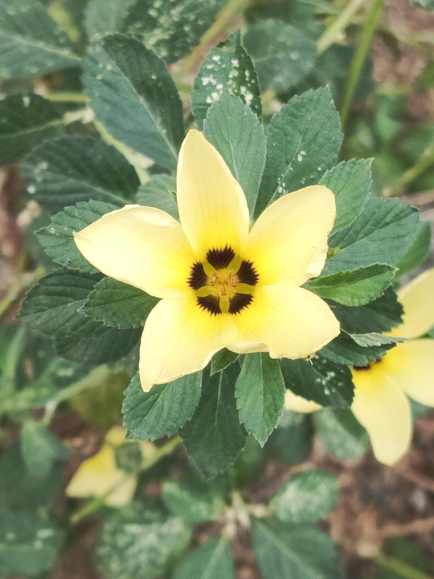 A close-up shot shows a yellow Turnera ulmifolia flower with a black and brown center, surrounded by green leaves