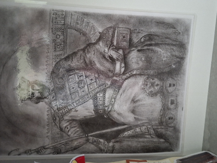 A monochromatic drawing, executed in charcoal or graphite, is displayed vertically on a light-colored wall or panel in Nova Zagora, Bulgaria
