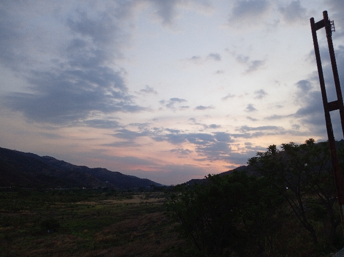 The scene depicts a landscape at dusk or dawn in the city of Sabaneta, Venezuela. The upper two-thirds of the image display a sky with scattered grey and white clouds, transitioning from a light blue-grey overhead to a pale pink-orange glow near the horizon, indicating low sunlight. In the foreground, extending across the bottom left and center, is an expanse of undeveloped land covered with dry, dark green and brown vegetation. To the left, a series of dark, undulating hills or mountains forms the backdrop, their slopes appearing heavily vegetated and silhouetted against the sky. Faint pinpricks of light, possibly from distant vehicles or structures, are visible along the base of these mountains. On the far right side of the image, a tall, dark, rusty-brown metal structure, appearing as a two-pronged pole or support beam, extends vertically from the bottom edge almost to the top. Immediately to the left of this structure, and continuing into the lower right foreground, is dense, dark green foliage from several trees. No human figures are present.