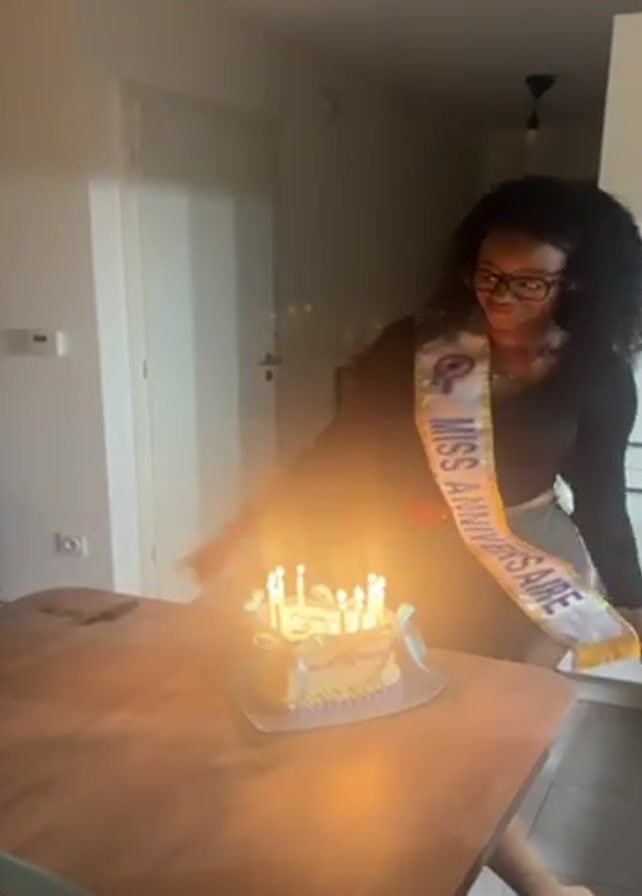woman wearing a "Miss Anniversaire" sash standing by a birthday cake with lit candles. She is smiling and looking at the cake. The room is lit by the candles and an overhead light. The woman blows out the candles. The video shows more people in the room, sitting around a table with red cups, balloons, and phones. They are blurry but appear to be celebrating.
