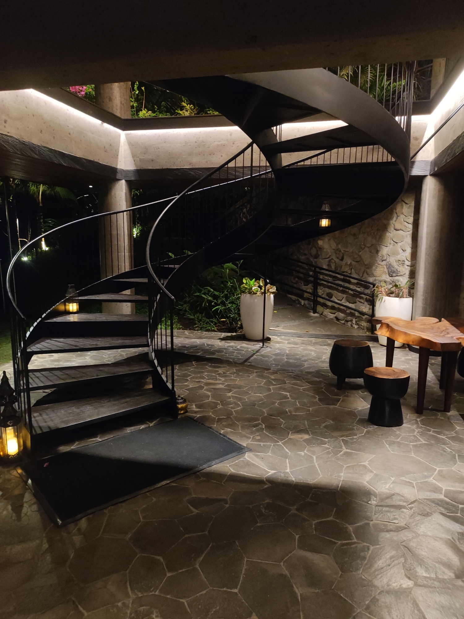 This image depicts a dimly lit outdoor or semi-outdoor common area in Mas, Indonesia, at night. The central feature is a large, black metal spiral staircase with dark wooden treads and a matching metal handrail, ascending towards the upper levels of a multi-story structure. At the base of the staircase, a black rectangular doormat is visible, and a decorative antique-style lantern with a warm glowing light source sits on the flagstone floor beside it. The floor throughout the scene is paved with irregular, light-colored flagstones. To the right of the staircase, a seating area is arranged, consisting of a rustic wooden table with a natural, live-edge top and three dark, cylindrical stools with wooden seats. Beyond this, a stone-faced wall extends, partially obscuring a darker, possibly sloped pathway or ramp with a low black railing. Two tall, white cylindrical planters containing green foliage are positioned near this wall. The surrounding environment features concrete columns and walls, some of which are illuminated by horizontal, warm-toned LED strip lights embedded along their edges. Lush green vegetation and darker foliage are visible in the background and upper sections of the scene, indicating an integrated garden or natural setting. No individuals or active subjects are present in the image; the scene is static.