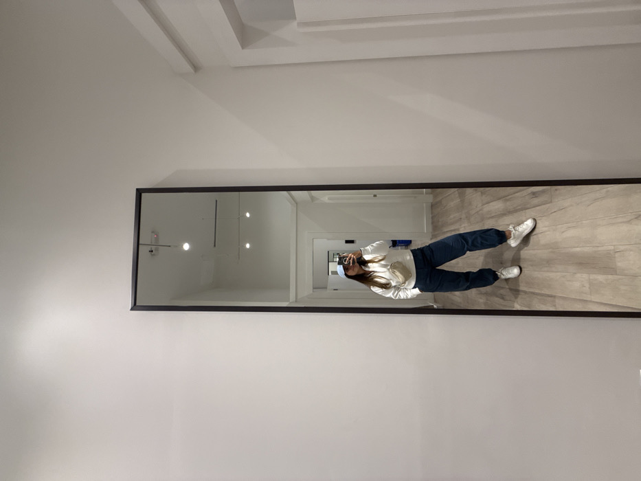 A long mirror hangs horizontally on a white wall. The mirror reflects an interior space, with a hallway visible in the background. A person is reflected in the mirror, standing on a tiled floor. The individual wears dark blue pants, a white sweatshirt, and white sneakers, and has a light blue hat. The person is holding a phone and appears to be taking a picture in the mirror. Overhead lighting is reflected, and ceiling molding is visible above the mirror on the wall.