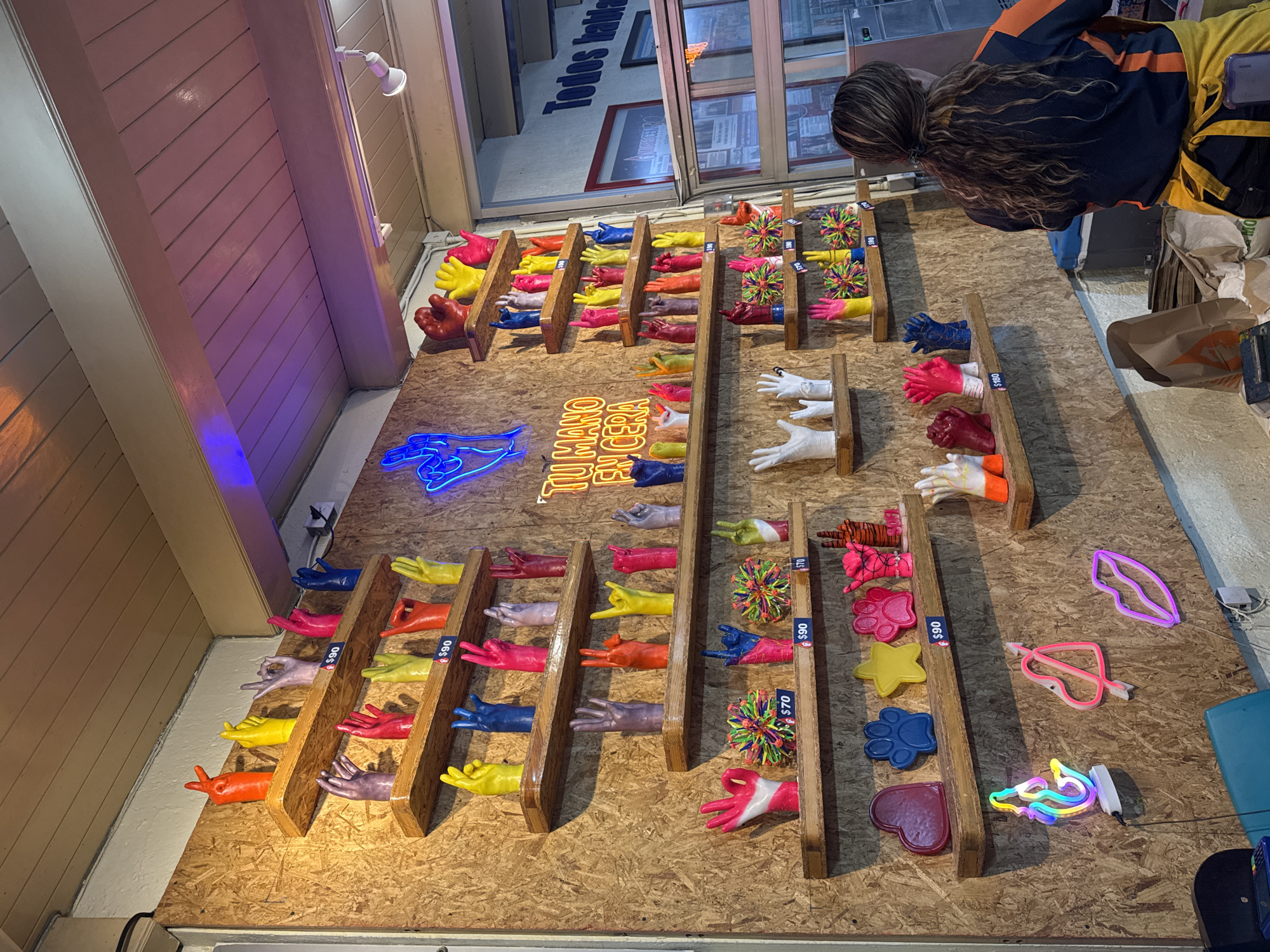 display of colorful wax hands and neon signs mounted on a plywood wall. The wax hands, in various colors such as red, yellow, blue, and pink, are displayed in small wooden shelves. Each shelf also has a price tag. The neon signs include shapes such as hearts, paw prints, stars, lips, and an arrow through a heart. A person with dark hair is looking at the display. The wall also features a larger neon sign that reads "TU MANO EN CERA" (Your Hand in Wax). A sign with the words "Todos lala" is visible through the window. This scene is located in Mexico City, Mexico.