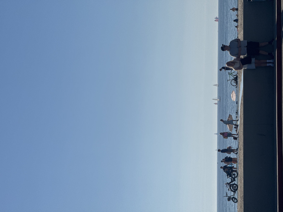 The image depicts a sunny day at Venice Beach, in the city of Los Angeles, United States. In the immediate foreground, a dark gray concrete barrier extends horizontally across the frame. Two individuals, a male wearing a light collared shirt, dark shorts, and a baseball cap, and a female wearing a light-colored top and shorts, stand facing the ocean on the right side, leaning against the barrier. On the sandy beach directly behind the barrier, multiple people are present and engaged in various leisure activities. To the left, two electric bicycles are parked on the sand near a group of approximately six individuals, one of whom is holding a surfboard. Further to the right, another person carries a surfboard towards the water. An open, light-colored beach umbrella is visible on the sand, positioned near a parked green bicycle. Other individuals are scattered across the beach. The Pacific Ocean occupies the midground, appearing calm and blue. Approximately eight sailboats are visible in the distance, with one on the far right exhibiting red sails. The sky above is clear, cloudless, and a uniform light blue.