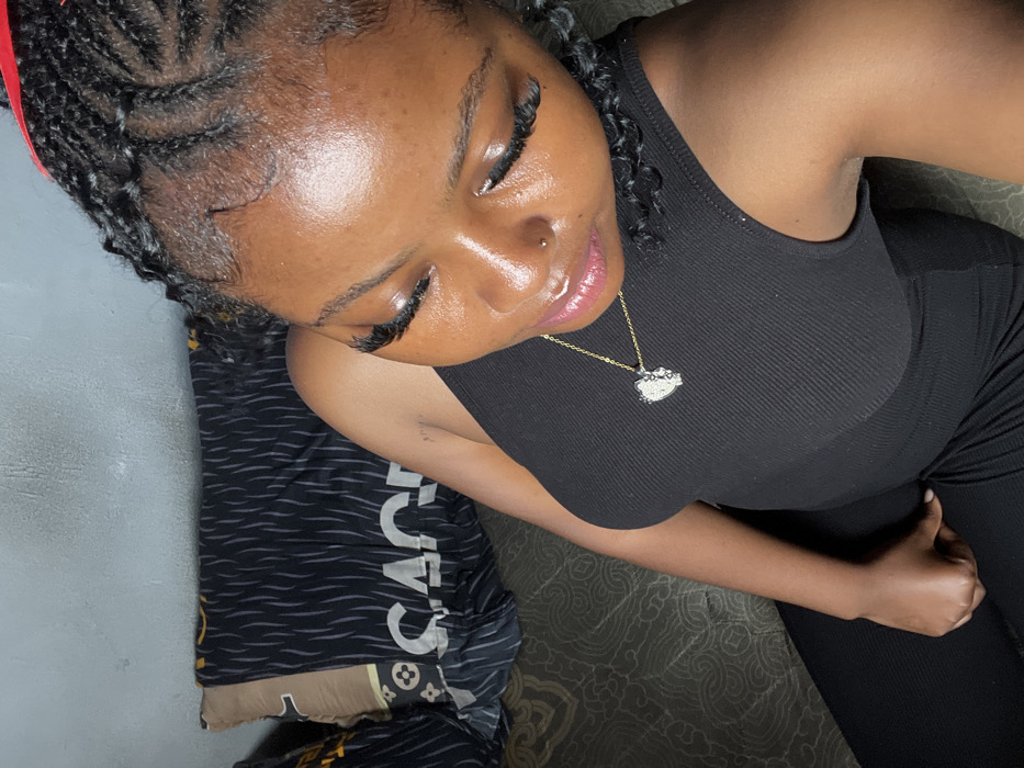 In a residential indoor setting in Asipa, Nigeria, a single individual with dark skin, appearing female, is seated and viewed from a high-angle perspective, looking downwards and slightly to the right of the frame. Her hair is styled in braids with cornrows on the scalp and looser curls; a red object is partially visible near the top of her head. Her face exhibits a glossy sheen on the forehead, nose, and cheeks. She has prominent long, dark eyelashes, a small nose stud on the left nostril, and full, glossy lips with a light red tint. A faint marking is visible on her upper left arm. She is dressed in a black, ribbed sleeveless top and matching black, ribbed pants. A thin, gold-colored chain necklace with a heart-shaped pendant, featuring both silver-toned and dark-toned sections with small reflective embellishments, hangs from her neck. Her right hand rests on her right thigh. Behind her, against a light grey, textured wall, are two pillows; one is dark with a wavy striped pattern and the word "CAGE" in white capital letters, and the other, partially visible, has a brown section with a patterned design. The surface she is seated on is dark with a subtle pattern.