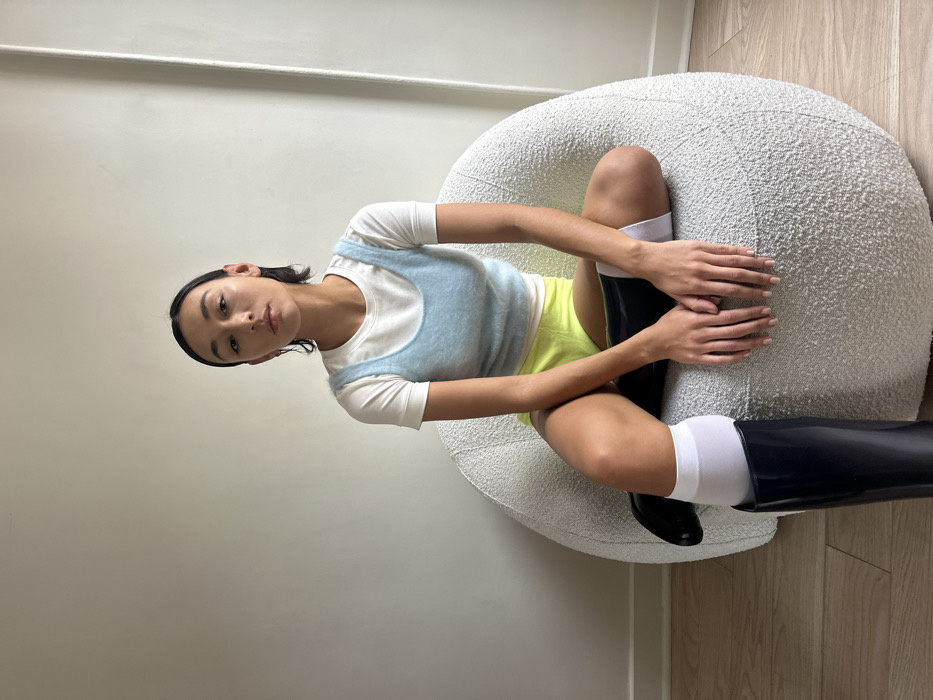 An individual is seated in a light-colored, textured armchair against a plain, off-white wall in what is presumably a private residence or studio in Paris, France. The person, an adult with dark, short hair, is positioned centrally, facing directly towards the viewer with a neutral expression and direct gaze. They are dressed in a white short-sleeved t-shirt overlaid with a light blue, fuzzy sleeveless top. Bright neon yellow shorts are worn underneath. Their legs are crossed, with the right leg resting over the left. White knee-high socks are visible, and the left foot is clad in a shiny, dark, knee-high boot, while the right boot is not visible. Both hands are clasped together and resting on the right thigh. The room features a light-colored wooden floor visible in the lower left and right corners. No other objects or individuals are present in the immediate vicinity.