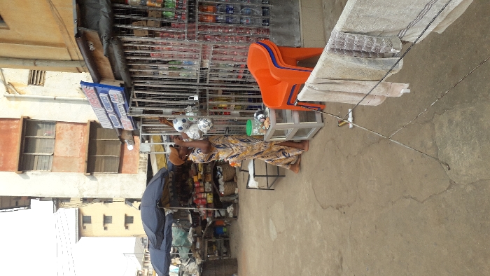 The image depicts a street scene in Onitsha, Nigeria, characterized by commercial activity