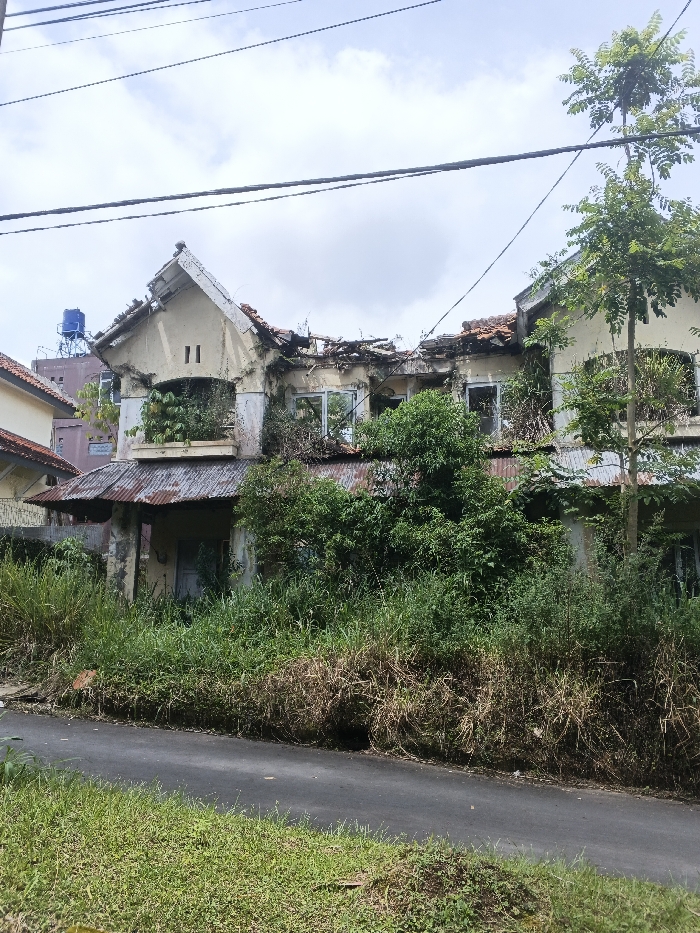 The image depicts a dilapidated two-story residential building located in Ciherang, Indonesia