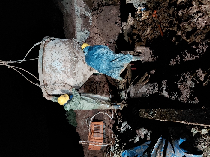 Two workers wearing yellow hard hats guide a large, soiled concrete bucket suspended by cables, while standing in a muddy excavation. One worker wears a blue garment; the other wears a green one. Various pipes, boards, and an orange grid-like object lie nearby. The surrounding earth appears dark and disturbed, indicating an active construction site environment. The scene is dimly lit, possibly at night.