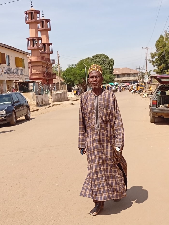 An elderly man is captured mid-stride on a paved road in Unguwar Gabas, Sabon Gari Street, Zaria, Nigeria, under a clear, bright sky