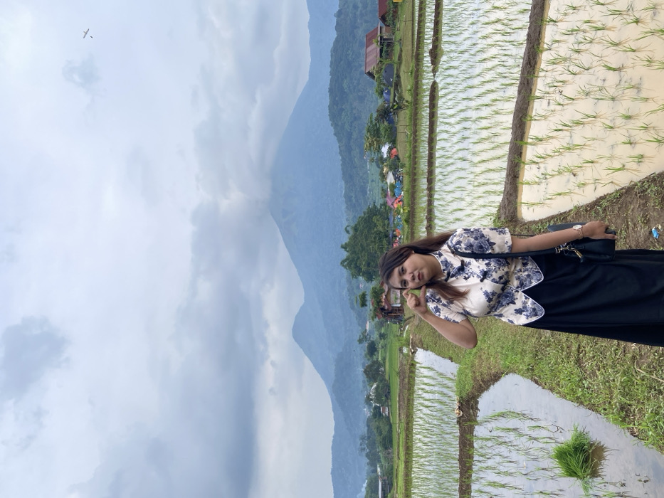An outdoor, eye-level photograph taken in Selotapak, Indonesia, depicts a female individual standing in a rice field with a mountainous backdrop under an overcast sky