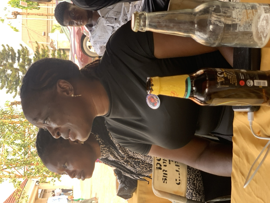 This image depicts an outdoor social gathering in Ogbunike, Nigeria, under bright daylight conditions. In the foreground, an adult female with dark skin, wearing a black short-sleeved top and a circular badge on her left chest, is seated at a table. She has braided hair styled back and a gold-colored drop earring in her right ear. Her head is turned to the right, and she is looking upwards. To her left, partially obscured, a second adult female with dark skin, wearing a black and white patterned high-necked top with braided hair, is also seated and looking in the same direction. On the yellow-covered table in front of the main subject, a dark glass bottle of Guinness Foreign Extra Stout, with a yellow neck foil and a green/blue band, stands upright. Next to it is an empty clear glass bottle. A white charging cable is visible on the table, connected to a dark electronic device. Behind the second female, a light-colored chair back with stenciled black lettering, partially legible as "SIR O..." and "C.J.", is visible. In the mid-ground, to the right of the main subject, a young adult male in a light-colored patterned shirt is seated, looking towards the camera. The background features a maroon sedan parked behind the male subject, along with light-colored buildings with red roofs, and green trees and foliage. The ground appears to be a light-colored, possibly dusty, surface.