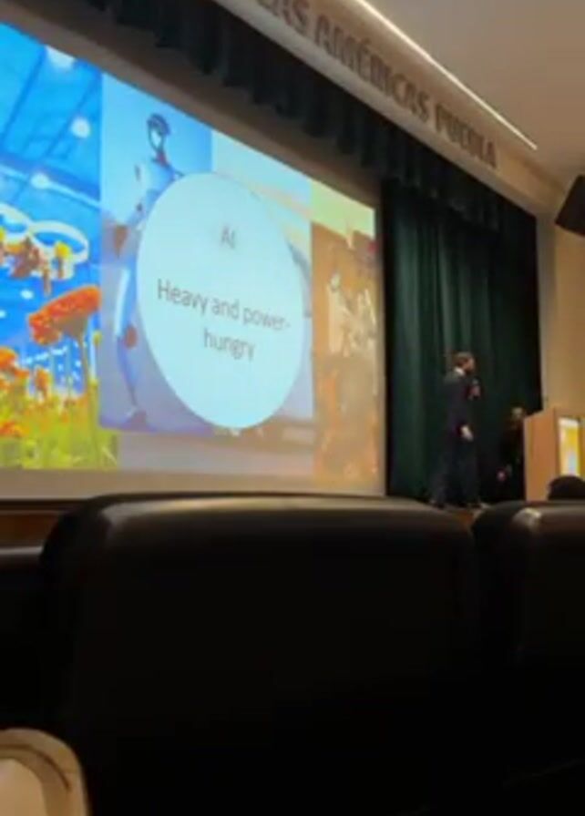 man giving a presentation in a large lecture hall. He is standing at a podium in front of a large screen that displays a slide with the title "AI" and the text "Heavy and power-hungry." The slide also includes images of a field of flowers, a robot, and a crowd of people. The man is wearing a dark suit. There are several rows of empty seats in front of him. The hall has dark green curtains along the back wall, and a sign above the screen reads "Universidad de las Américas Puebla."