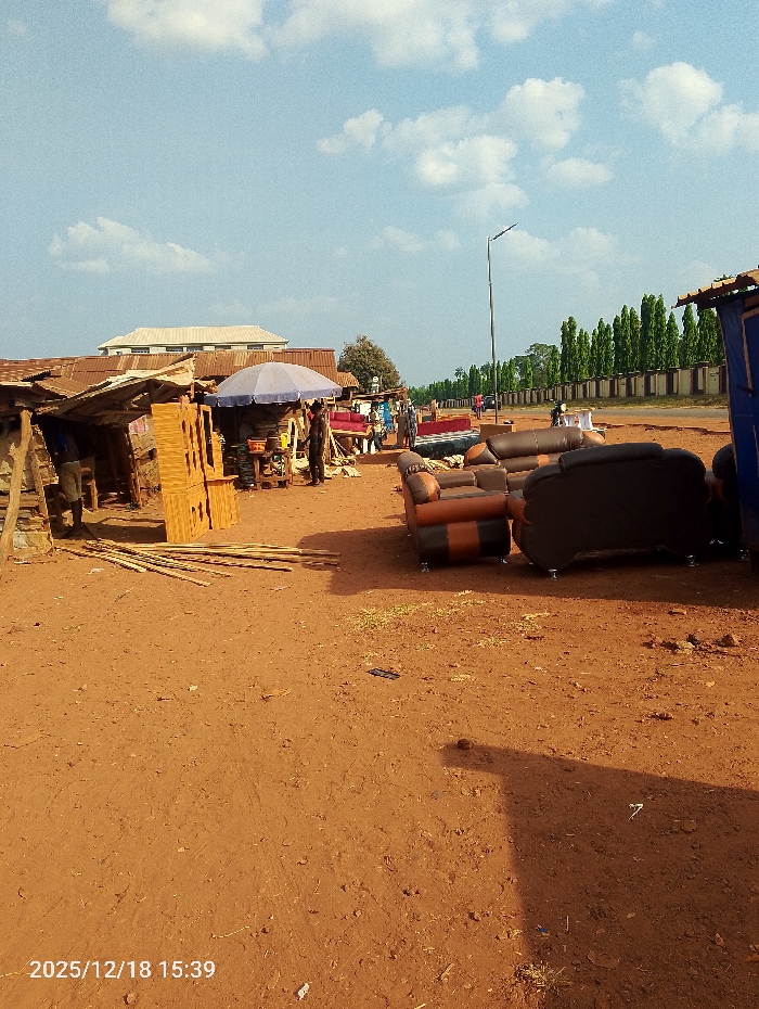 An outdoor marketplace is captured in a wide shot on a sunny day. Stalls and makeshift structures line the edge, displaying furniture. Sofas and other items are visible. The ground is reddish dirt, and a street runs along the side with a row of tall, thin trees. A light pole stands tall. The sky is blue with scattered clouds, with a building in the distance. The date "2025/12/18 15:39" is stamped on the bottom left corner of the image.