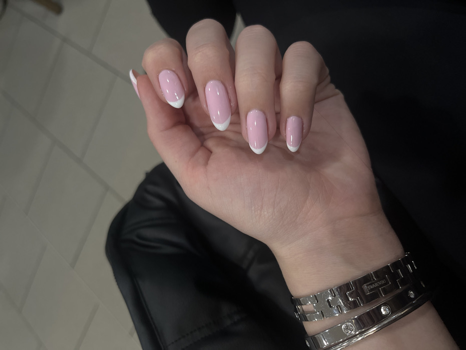 The image presents a close-up view of a person's left hand and forearm in an indoor setting, identified as being within the city of Pleven, Bulgaria. The hand, with light-toned skin, is positioned slightly angled, revealing five fingers. Each fingernail is manicured in a French style, featuring an oval shape, light pink nail beds, and distinct white tips. Two silver-toned bracelets adorn the wrist. The inner bracelet is a smooth, solid bangle embellished with six regularly spaced circular clear stones. The outer bracelet is a link-style design, with the word "SWAROVSKI" visibly engraved on one of its segments. To the left of the hand, a dark, padded surface, consistent with a chair or armrest upholstered in leather or synthetic material, is partially visible. The background consists of a blurred, light-colored tiled floor arranged in a grid pattern. A section of dark clothing is visible in the lower right portion of the frame. No specific actions or interactions are depicted beyond the presentation of the hand and its accessories.