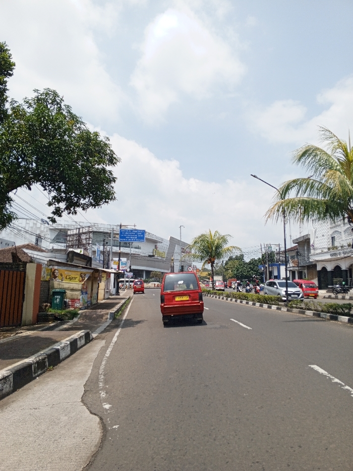 The scene depicts a multi-lane asphalt road in a city environment during daytime, under a partly cloudy sky. While the prompt specifies the location as Multhan, India, visual evidence contradicts this; road signs identify "Cibereum" and "Cimahi" (locations in West Java, Indonesia), and the leading red minivan displays an Indonesian license plate format, "D 1109 BC." The road features at least two lanes of travel in the visible direction, separated by a raised median with small plants. A red minivan travels away from the viewer in the rightmost lane. Further down the road, another red minivan, a silver sedan, and several motorcycles are visible in traffic or parked on the right side. On the left side of the road, a concrete sidewalk with a black and white striped curb is present. A large green tree with dense foliage occupies the far left. Adjacent to the sidewalk are several single-story structures, possibly small shops, one displaying a "Cigar" advertisement featuring a woman. A brown fence is also visible on the left. Overhead power lines span the scene. On the right side, a palm tree and a street light pole are positioned near the road. Buildings with varied architectural styles, some featuring intricate white facades, line the street. In the background, a large, modern building, likely a shopping mall, with glass and steel elements and partially visible signage (appearing to include "PLAZA"), stands beneath an overhead blue traffic sign mounted on a gantry structure. No clearly identifiable human figures are discernible.