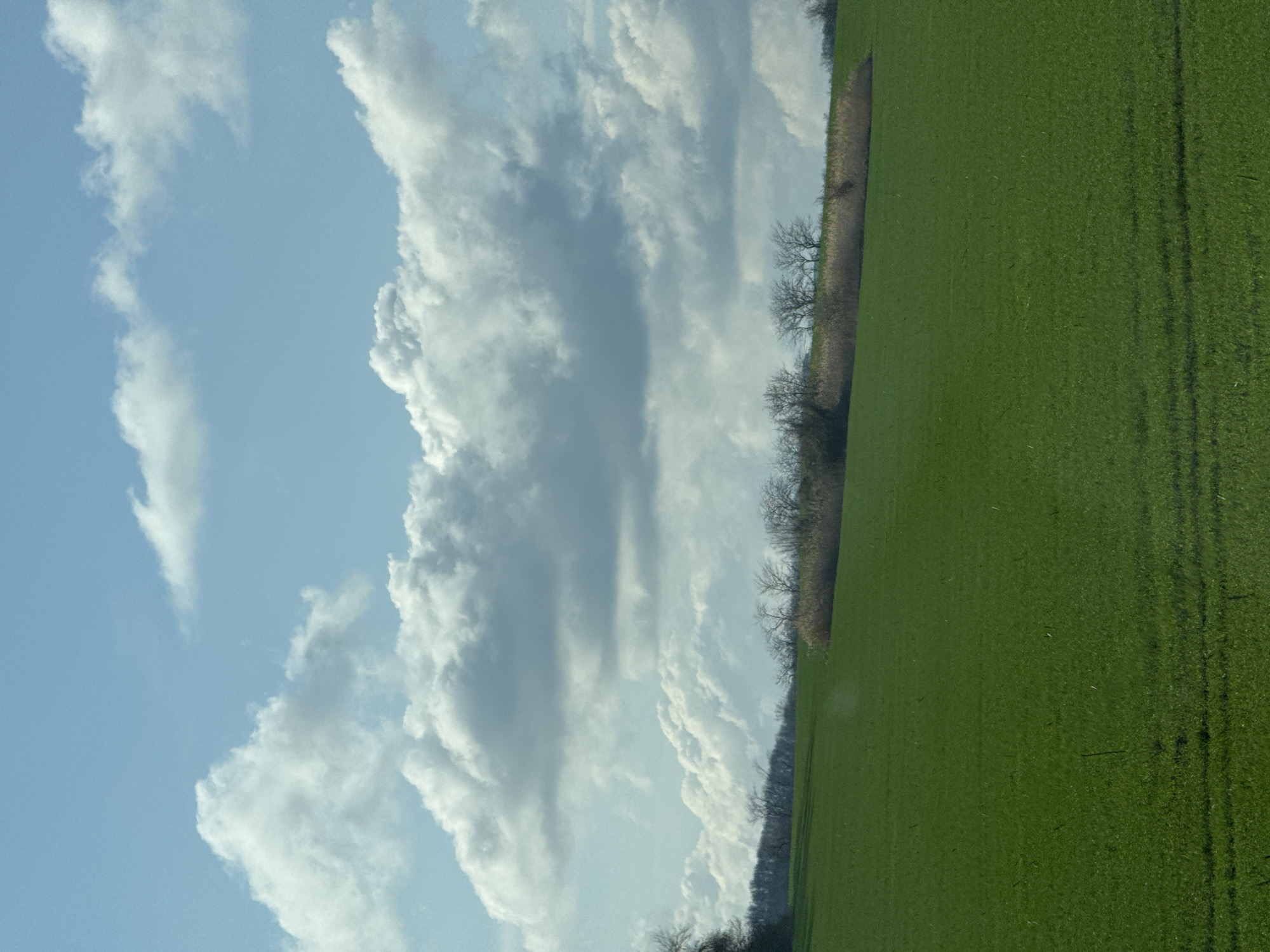 landscape with a green field on the right side and a sky with clouds on the left