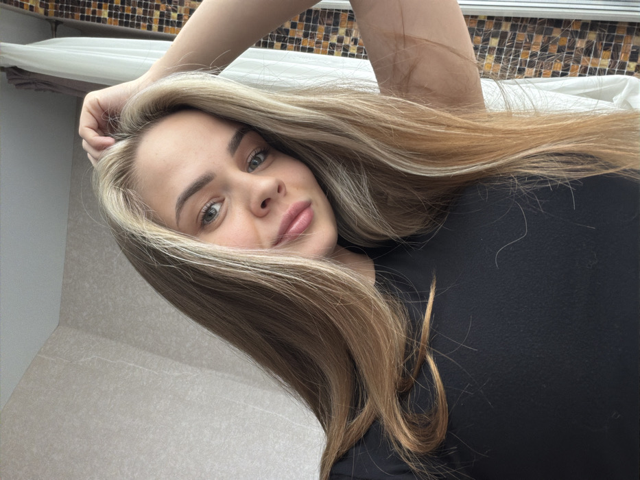 A woman with long, blonde hair poses in front of a tiled wall. She rests her hand on her head, her eyes looking directly at the viewer. She has fair skin, rosy cheeks, and pink lips. Her hair is highlighted with lighter blonde shades. She wears a black shirt. The background is a mix of beige tiles and patterned mosaic tiles, suggesting a bathroom setting.