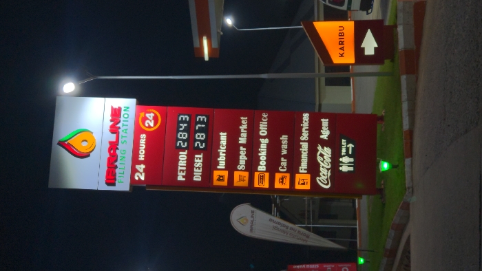 gas station sign with various services listed. Petrol costs 2843 and diesel costs 2873. Additional services include lubricant, a supermarket, booking office, car wash, financial services, and a Coca-Cola agent. The station is open 24 hours. The sign also points to the direction of a toilet with a symbol of a man and woman. A sign with an arrow and the word "Karibu" is visible on the right.