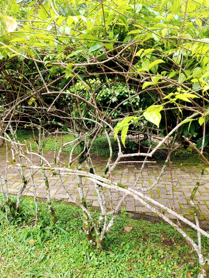 The image displays a close-up, ground-level view of dense vegetation and a partial paved pathway in an outdoor setting. In the immediate foreground, vibrant green grass covers the ground. Rising from this grass is a row of small, woody plants or shrubs characterized by numerous slender, gnarled branches that are largely bare of leaves. These branches exhibit patches of white and light green lichen or moss. Behind this row of plants, a section of a paved pathway is visible. The pathway is constructed from rectangular, light-colored pavers laid in a staggered bond pattern. Many of these pavers and their crevices show significant growth of green moss or algae. Beyond the pathway, additional green ground cover and foliage are present. The midground and background consist of a dense, intricate mass of leafy green vegetation and intertwining branches, forming a thick natural screen. Individual light green leaves are discernible within this dense foliage. The scene is illuminated by diffused natural light, indicating daytime. No human figures, animals, or artificial structures other than the pathway are identifiable. No specific actions or interactions are depicted. The exact location within the city of Kanand, India, is not visually determinable from the image content.