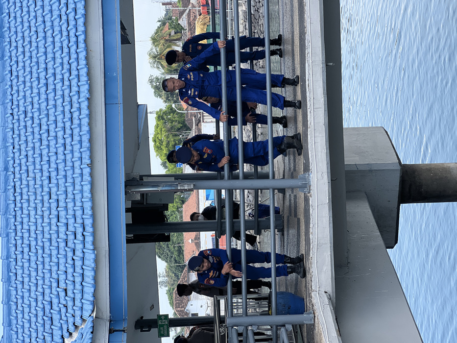 The image depicts an outdoor scene on a concrete pier in Ketapang, Indonesia, under an overcast sky. A prominent blue-tiled roof covers a section of the pier, which is supported by grey concrete pillars extending into calm blue water. Approximately ten individuals are visible on the pier. In the foreground, three males are dressed in dark blue uniforms featuring "POLRI" (Indonesian National Police) patches and dark boots. The central figure, an adult male, stands facing forward, smiling, with both hands resting on a grey metal railing; a name tag appearing to read "T. SAYUDI" is visible on his uniform. To his left and right, two younger males, similarly uniformed, lean over separate sections of the railing, looking downwards. Other individuals are present in the mid-ground and background; some appear to wear dark uniforms, while one individual is observed in a dark shirt and a white face mask. A green sign with white text, "JALAN EVAKUASI" (Evacuation Route) and a left-pointing arrow, is affixed to a structural column on the left side of the pier. A blue cylindrical container rests on the pier deck near the left railing. The background reveals an urbanized shoreline featuring various buildings, including some with red or orange roofs, interspersed with trees and utility poles.