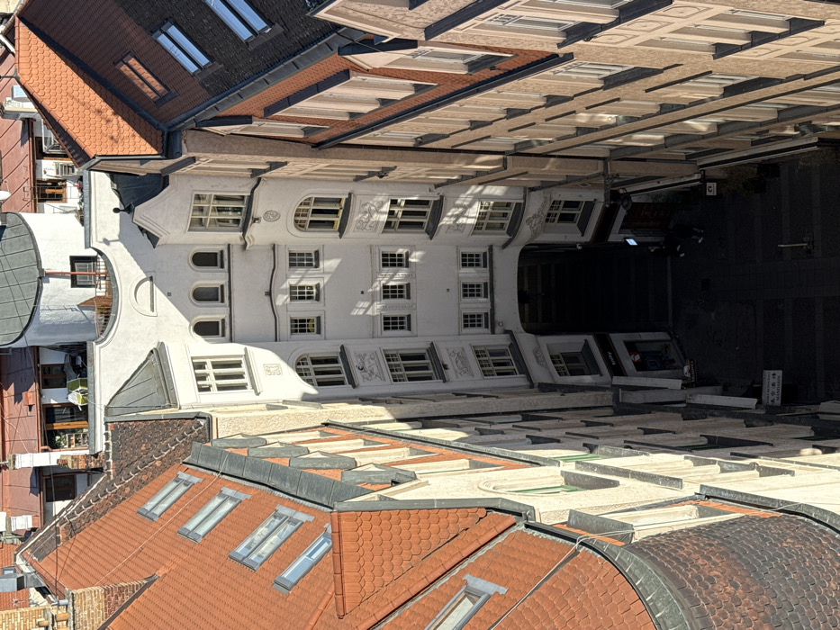 - "An aerial, high-angle view looks down into a narrow, canyon-like urban alleyway or courtyard within the city of Brno, Czechia" by FM-nRr0I2, licensed under CC BY 4.0