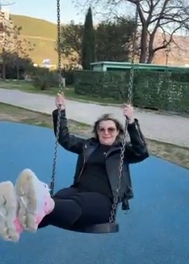 A woman in a black outfit and pink-striped sneakers swings on a swing set in a park