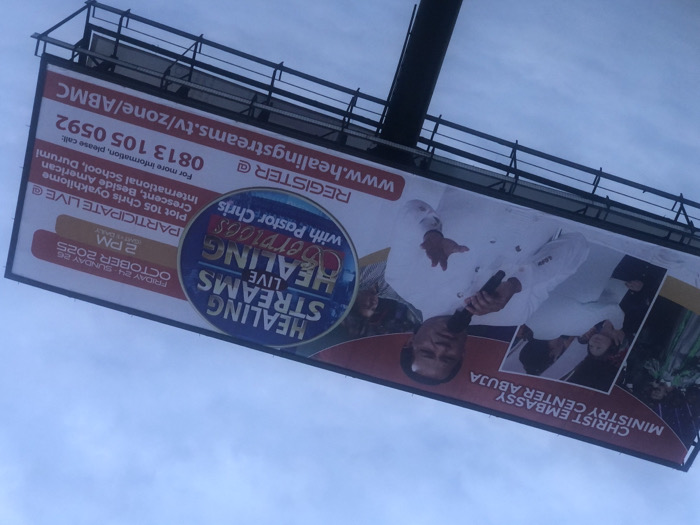- "A large outdoor billboard, viewed from a low angle against an overcast sky, advertises "HEALING STREAMS LIVE HEALING Services with Pastor Chris" from Christ Embassy Ministry Center Abuja" by FM-RFAH52, licensed under CC BY 4.0
