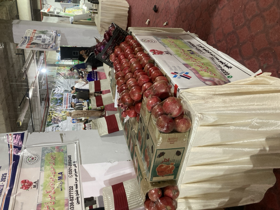 This image depicts an indoor agricultural exhibition or trade show in Quetta City Tehsil, Pakistan. In the foreground, a table covered with a cream-colored, pleated tablecloth displays a substantial quantity of pomegranates. Several cardboard boxes, some with visible pomegranates individually wrapped in clear plastic, are arranged on the table. A large pyramid-like mound of loose red pomegranates occupies the center and right side of the table. A black plastic crate, tilted on its side and filled with additional pomegranates, rests at the far right of this display. A white banner affixed to the front of the table features the "International Trade Centre" logo, "M.A. Trademark," text in Urdu, and contact numbers. In the midground, to the right, another table with a cream tablecloth displays small bottles, possibly containing agricultural products. A male individual is seated at this table, engaged with a device. The floor is covered with a red patterned carpet, and scattered litter is visible near the table on the right. The background shows multiple individuals, predominantly men, interacting around various exhibition booths. One man in the mid-left wears a hat. Other display tables are present, some with chairs featuring maroon fabric covers. Banners with images of agricultural produce and text, primarily in Urdu, are visible on the back walls. The ceiling is industrial, featuring visible ductwork and artificial lighting. The overall scene suggests a commercial or public event centered on agriculture.