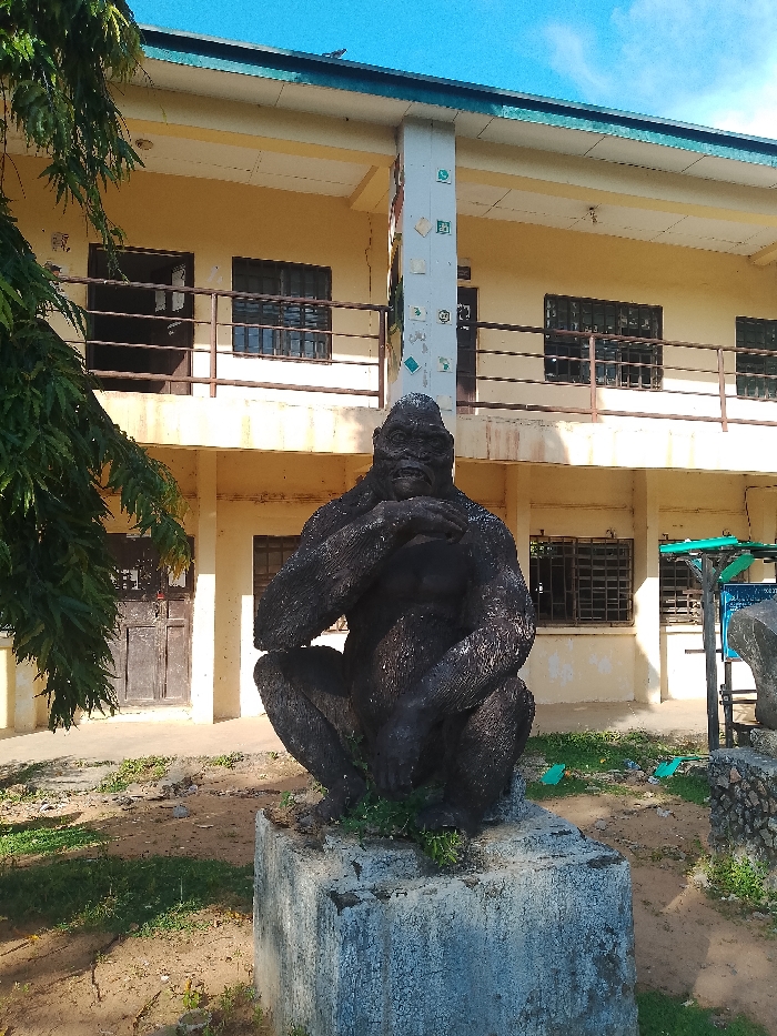 A dark, textured statue of a gorilla, depicted in a contemplative seated posture with its left hand near its chin, stands prominently on a weathered, light-colored concrete pedestal. Behind the statue, a two-story building with a faded yellow facade and a dark-colored roof is visible. The building features an upper-level balcony with a dark railing, multiple windows with dark frames and security bars, and several visible doorways. A supporting pillar on the building's facade displays various small, square, colorful affixed items. The ground surrounding the statue is composed of dry earth and sparse green vegetation. A portion of a leafy tree branch is visible on the left side of the frame. The sky above is clear and blue with scattered white clouds. This scene is located in Lokoja, Nigeria.