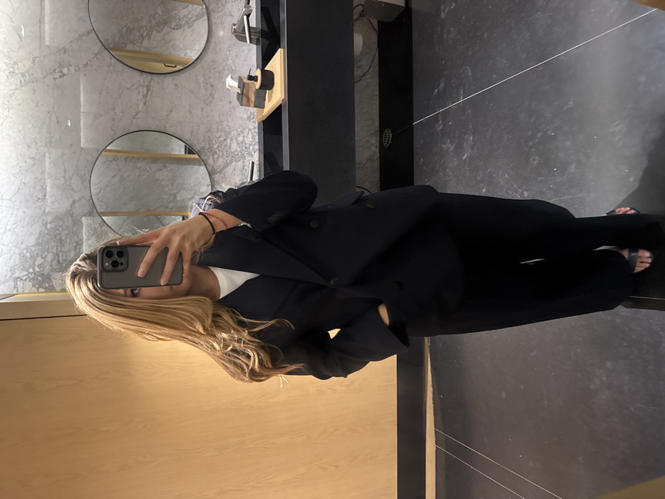 A woman in a dark blazer and pants takes a selfie in what appears to be a bathroom. The backdrop features a marble wall with two round mirrors and a modern sink fixture. The floor is a dark, glossy tile. She holds her phone up, partially obscuring her face, and has blonde hair. Her outfit suggests a professional or semi-formal setting, contrasting with the bathroom location.