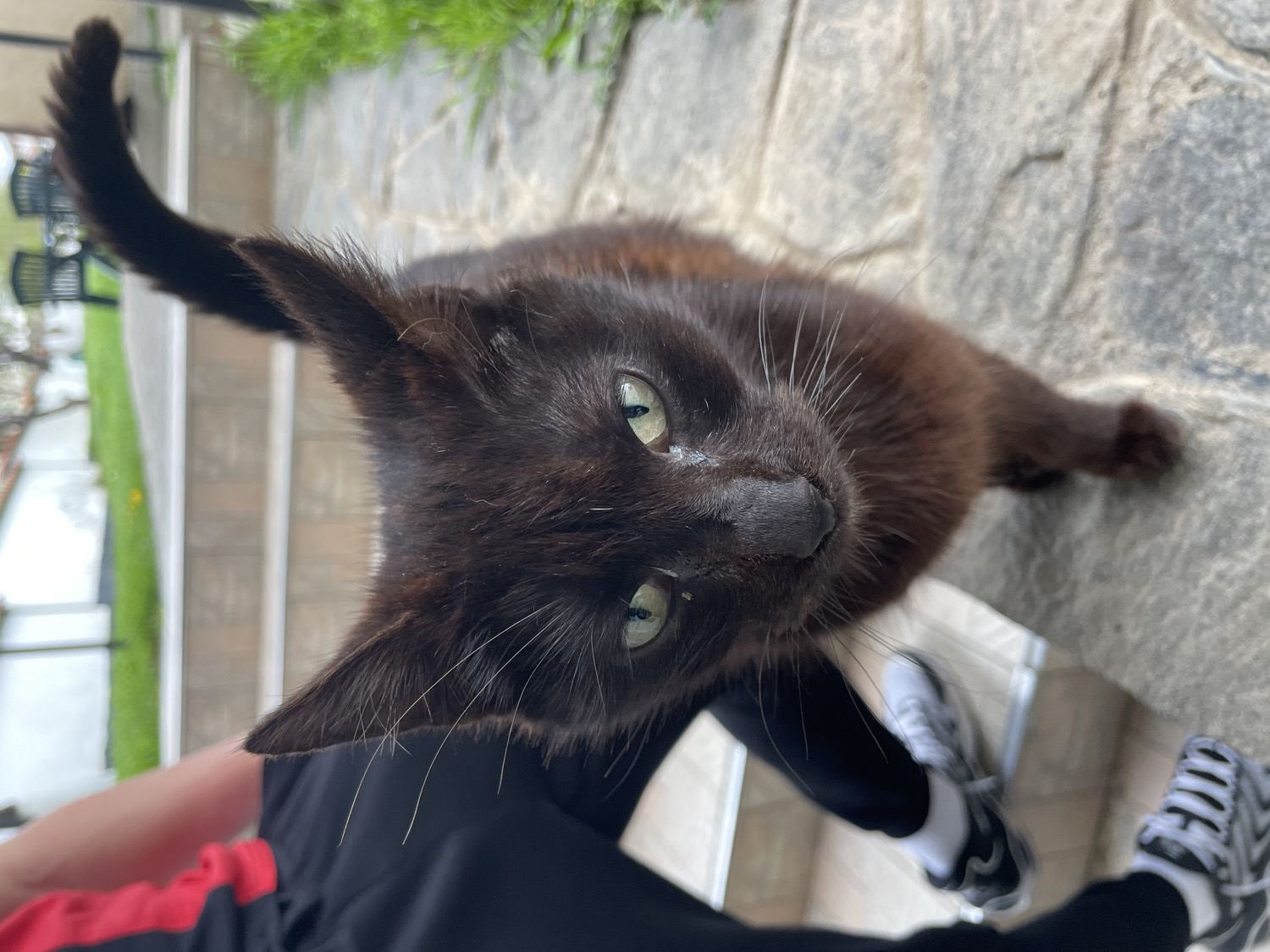A cat is the primary subject, viewed from an overhead perspective. The cat, predominantly black with brown tints, faces the camera with its head angled upwards. Visible features include green eyes, white whiskers, and a wet nose. The cat is situated in close proximity to a person, whose legs and shoes are partially visible at the bottom of the frame. The person is wearing black leggings and black and white sneakers. A red and black garment is also slightly visible. The background features a stone patio or walkway, transitioning into a staircase. The scene appears to be outdoors, potentially in a residential area. Based on visual markers and the prompt instructions, the image is likely from or near Benkovski, Bulgaria. Additional background details include glimpses of greenery and a building exterior. The overall lighting is natural, suggesting a daytime setting.