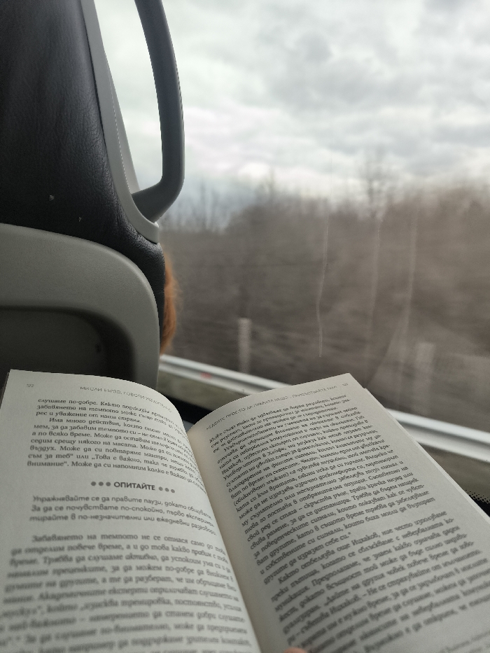 The image displays an interior view from a moving vehicle, likely a bus or train, situated in the city of Osikovitsa, Bulgaria. In the immediate foreground, an open paperback book with text printed in Bulgarian is held by an unseen individual's hand, partially visible at the lower right. The left page of the book clearly displays the page number '22' at the top. To the upper left, a dark-colored vehicle seat, possibly upholstered in leather or synthetic material, is visible, featuring a light grey grab handle. Faint reddish-brown hair belonging to an individual is discernible behind this seat. Through the vehicle's window, a blurred, undifferentiated landscape of bare trees and dense foliage stretches into the distance under an overcast, grey sky, indicating the vehicle is in motion.