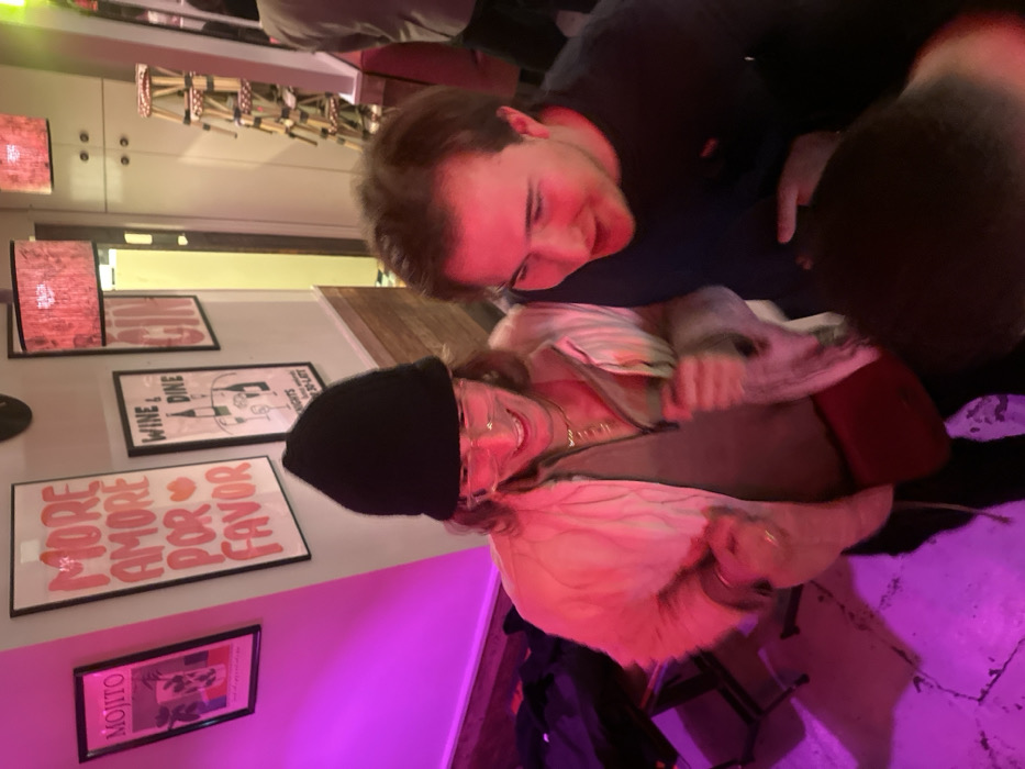The image depicts an indoor scene within a modern bar or cafe in Paris, France, characterized by a dominant magenta lighting scheme. The walls are light-colored with a lower section of wooden paneling, displaying several framed posters. Visible posters include a "MOJITO" advertisement, a large poster with "MORE AMORE POR FAVOR" in orange text, a "WINE & DINE" graphic, and a "GIN" sign. Two rectangular lampshades with a reddish fabric texture hang overhead. Three individuals are prominently featured. In the left foreground, an individual with long hair, wearing a black beanie, clear-framed glasses, a light-toned fuzzy jacket, a grey half-zip top, and a red crossbody bag, smiles broadly with an open mouth, indicating active engagement or movement. A gold-toned necklace is visible around their neck. To their right, a second individual, a male with short brown hair and a dark long-sleeved shirt, looks downwards and to the left, also smiling with an open mouth, suggesting interaction with a third person. The top of a third person's dark-haired head is visible in the bottom right corner of the frame. A fourth person, wearing a light-colored jacket, is partially visible in the far background. The floor is a light-colored, textured surface. The precise location within Paris is not ascertainable from the visual evidence provided.
