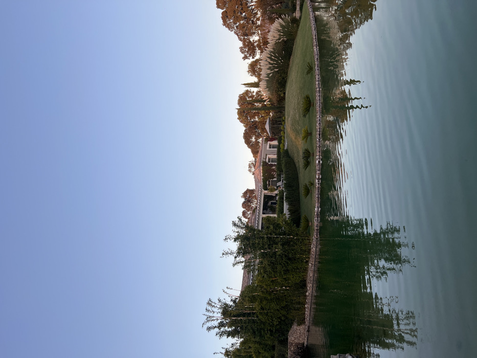 A serene view showcases a clear sky meeting the edge of a tranquil lake. The water reflects a stately house with manicured lawns, adorned with neatly trimmed hedges and decorative plants. Tall pampas grass and various trees add texture to the landscape, bordering the water's edge. The scene is bathed in the soft, diffused light of either sunrise or sunset, enhancing the peaceful ambiance.