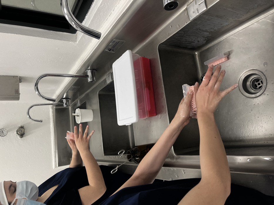 This image depicts a sterile hand-scrubbing station in Mexico City, Mexico, occupied by two individuals