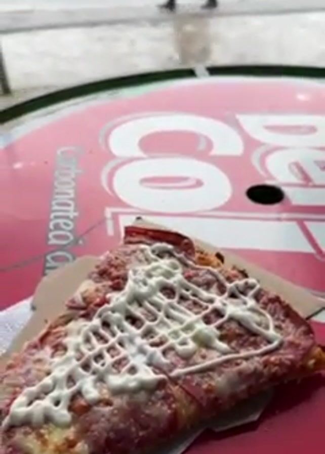 - "slice of pizza topped with white sauce on a small paper plate, sitting on a red, white, and green table with an advertisement" by FM-4jdnw2, licensed under CC BY 4.0