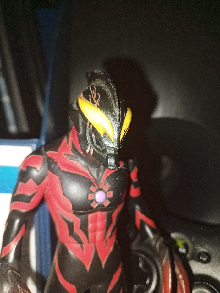 The image displays a detailed, medium close-up of a standing action figure. The figure is primarily black, with intricate, angular red patterns covering its torso, arms, and head, resembling armor or musculature. Its head is a stylized, black helmet-like structure featuring two prominent, bright yellow, almond-shaped eye-like elements. Subtle, reddish-brown, organic-like markings are present on the forehead of the helmet. A circular purple object with a lighter border is centrally embedded in the figure's chest. The figure's right arm (viewer's left) is visible, terminating in a dark, claw-like hand. The background is predominantly dark. To the left of the figure, a segment of a blue and white vertically striped object is partially visible. To the right, a dark, irregularly shaped object with circular indentations and a small, faint green light is partially visible. A direct light source illuminates the figure from the front-left, casting a distinct shadow on the dark surface behind it to the right. No discernible environmental or geographical features are present in the image to determine a specific location within the city of Unknown, Indonesia.
