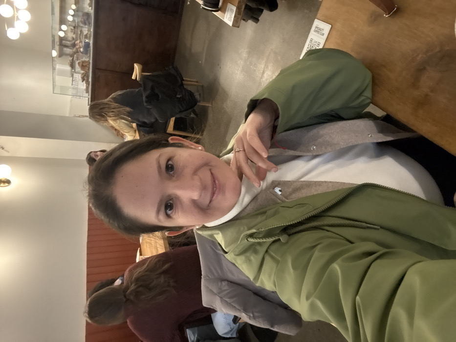 The image depicts an adult female capturing a selfie inside Pastelería Oiartzun, a bakery and cafe located in San Sebastián, Spain. **Scene Description:** In the foreground, an adult female with dark brown hair, styled with a middle part, smiles directly at the camera. She wears a white turtleneck, layered with a light brown snap-button shirt, and an olive green hooded jacket, partially unzipped. A silver-colored ring is visible on her left ring finger. A grey padded jacket is draped over a chair to her left. The setting is a modern cafe interior with light grey walls and a reddish-brown horizontally paneled banquette seating area along the left wall. Several patrons are visible in the mid-ground and background. To the left, two individuals are seated at a wooden table with their backs to the camera; one has long brown hair in a ponytail and wears a dark red top. Further back and to the right, another individual with long light-colored hair is seated at a wooden table, also with their back to the camera, and a dark jacket is draped over an adjacent chair. The establishment features distinctive lighting fixtures: a wall-mounted brass fixture with two spherical bulbs is visible on the left wall, and a cluster of multiple spherical bulbs hangs from the ceiling in the mid-ground. Along the far back wall, a dark wooden counter is topped with a clear glass display case containing various baked goods, including breads and pastries. The floor appears to be concrete or a similar industrial-style material. Wooden tables and minimalist wooden chairs are scattered throughout the space. The overall atmosphere suggests a casual, busy bakery or cafe.