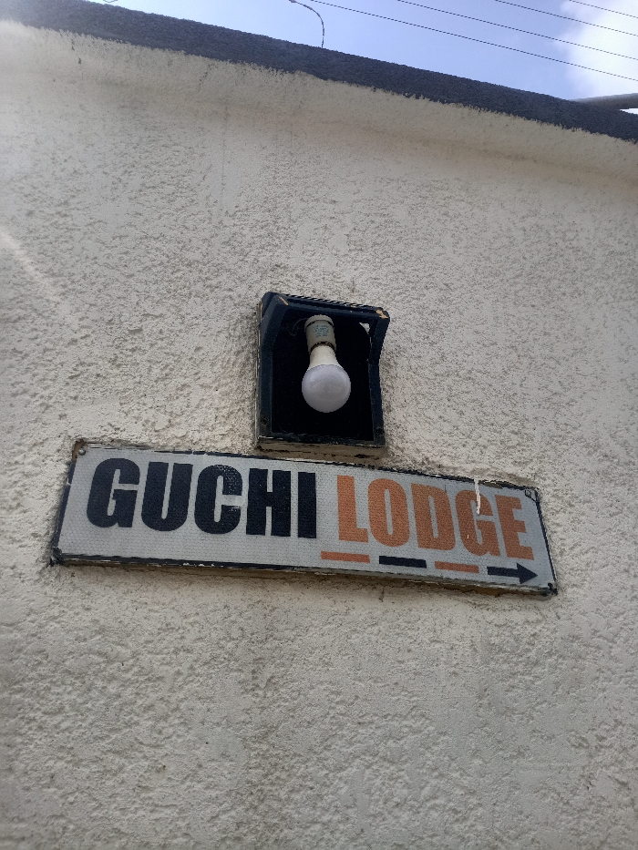 An exterior, low-angle daytime view captures a light-colored, textured building wall in the city of Unknown, Unknown. Mounted on the upper-middle section of the wall is a dark-colored, open-faced light fixture containing a white, opaque LED light bulb. Directly below the fixture, a rectangular sign is affixed to the wall. The sign features a white background with a dark border. The text "GUCHI" is prominently displayed in black, followed by "LODGE" in an orange-brown hue. Below "LODGE," a dashed line leads to a solid black arrow pointing right. Above the wall, a dark roofline or parapet is visible, topped by multiple thin security wires against a light blue sky. No individuals are present in the scene.