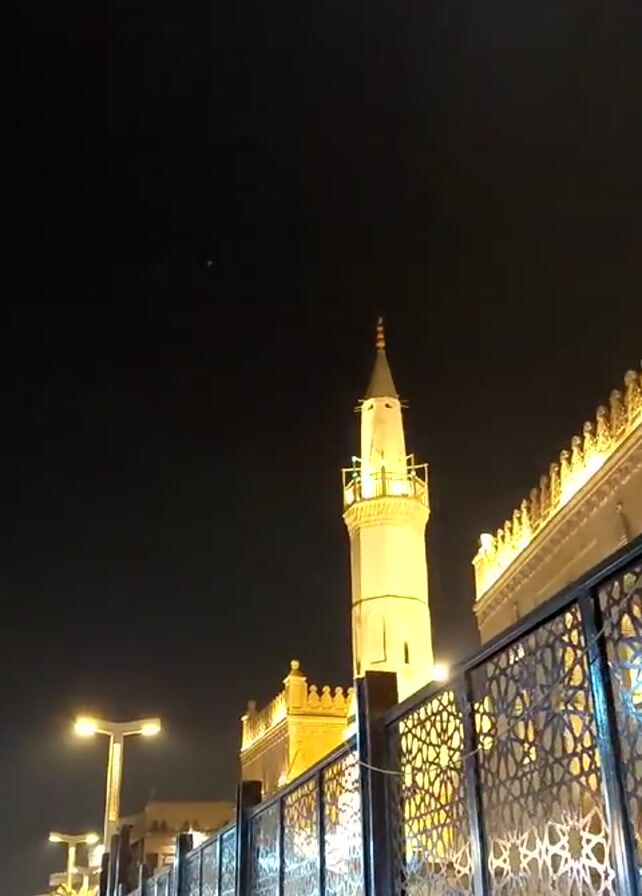 night scene of a mosque with a tall, well-lit minaret. A decorative metal fence runs alongside the mosque, separating it from a pedestrian walkway. Several people are walking along the walkway. Streetlights illuminate the area. The sky is dark. The overall impression is of a peaceful, illuminated religious site in an urban environment at night.