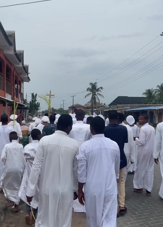 A large group of people dressed in white robes are walking down a street. Most of the people are holding palm fronds. A few people in the crowd are wearing white caps. One person in the crowd is wearing a navy blue jacket. The group is walking toward a gold cross mounted on a pole. The sky is overcast. There are buildings on both sides of the street.