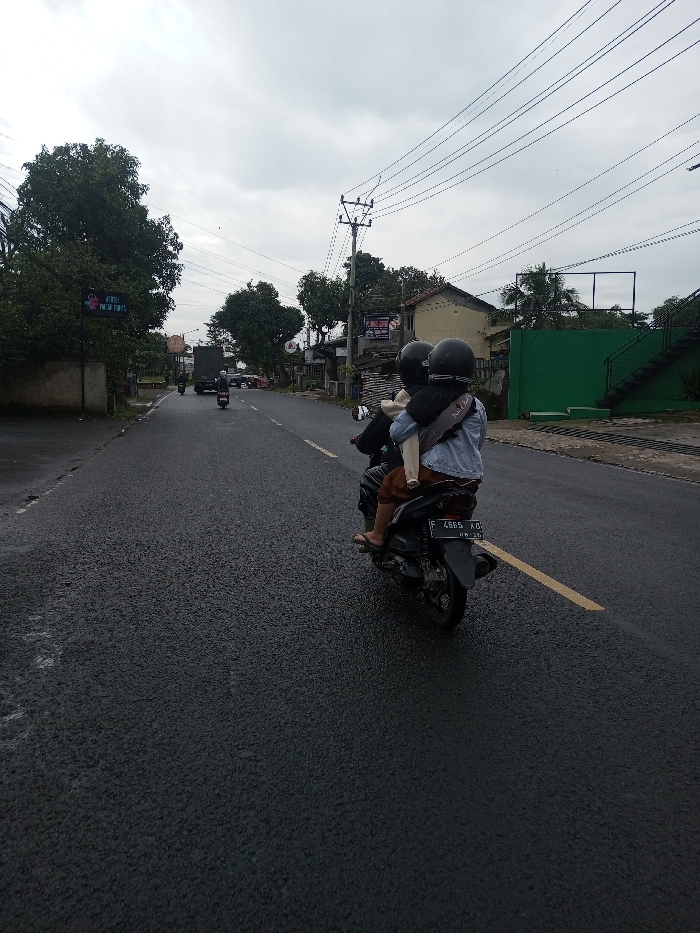 The scene depicts a street in the city of Kamji Na-Yekha, Bhutan, under an overcast sky. The dark asphalt road appears wet, possibly from recent rain, and features a faded yellow dashed center line. In the foreground, a dark-colored scooter with license plate F 4665 AD (06.24) travels on the right side of the road, partially over a broken yellow line fragment. Three individuals are on the scooter. The driver, wearing a black helmet and dark attire, operates the vehicle. Directly in front of the driver, a small child wearing a black helmet faces forward. A rear adult passenger, also wearing a black helmet, a light blue denim-style jacket, brown trousers, and sandals, is seated behind the driver and carries a dark cross-body bag. Further down the road, another scooter with a single rider (wearing a helmet) and a dark green truck are visible, both moving in the same direction as the foreground scooter. The left side of the road is lined with trees and a blue rectangular sign displaying white text, possibly "KOPI" and "MINUM," along with a graphic resembling a coffee cup or face. On the right side of the road, behind the scooter, residential or commercial buildings are visible. One notable structure is a vibrant green-painted building with black exterior stairs leading to an upper level. Multiple utility poles with overhead power lines span across the upper portion of the frame.
